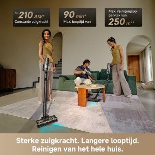 - Maximale zuigkracht (210 AW) — verwijdert hardnekkig vuil en ingezoomde stof zonder meerdere keren over dezelfde plek te hoeven gaan.