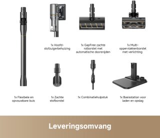 - GapFree™ AI-robotarm voor 0 mm randreiniging — vuil langs plinten en muren wordt automatisch opgespoord en direct opgezogen, zodat je nooit handmatig hoeft bij te werken.